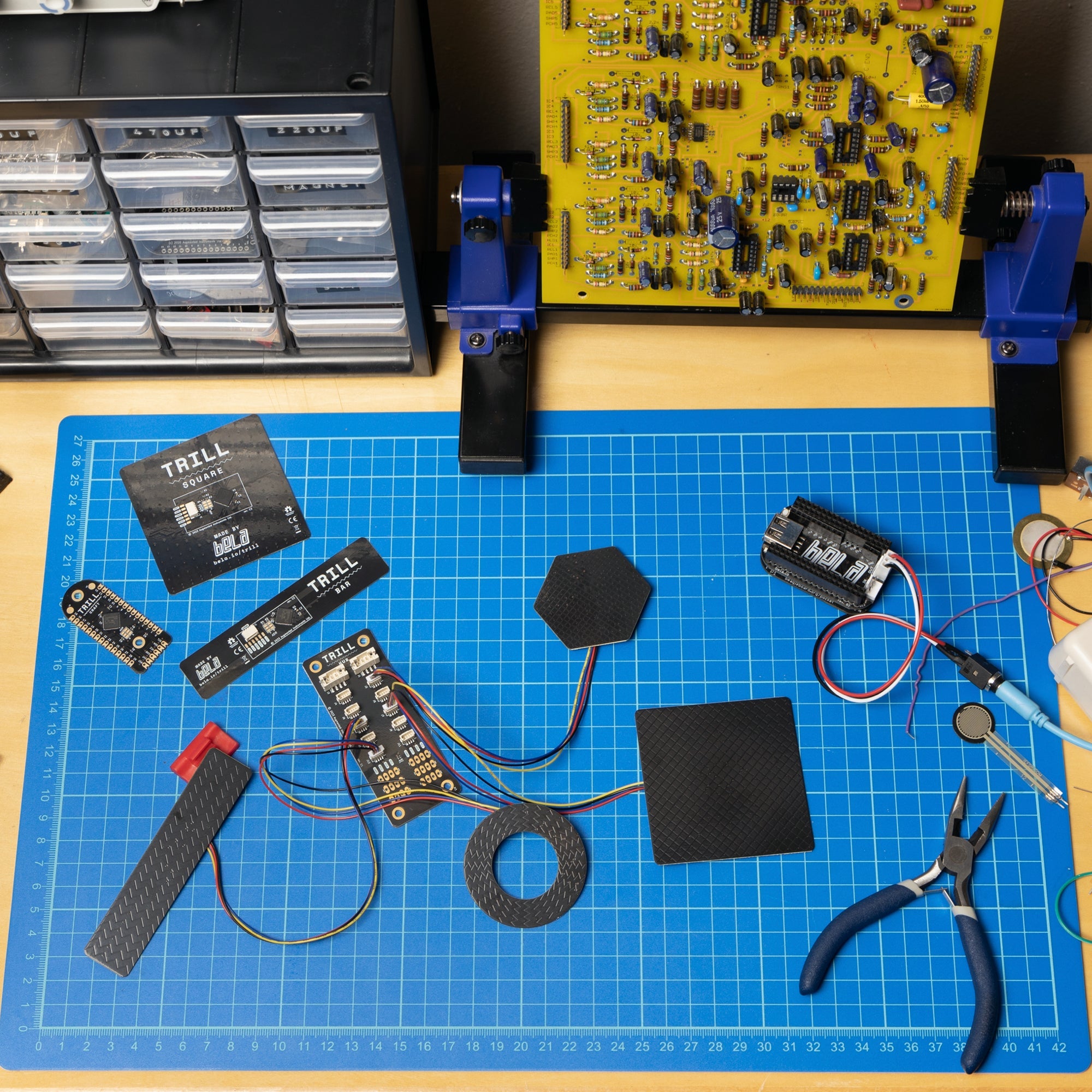 Trill is a family of touch sensors that launched on Kickstarter in 2019. Inspired by the way we use our hands to interact with the world, Trill sensors use capacitive touch technology to make it easy to add high-resolution and natural touch interaction to your interactive projects. Find out everything you need to know about using Trill at learn.bela.io/trill